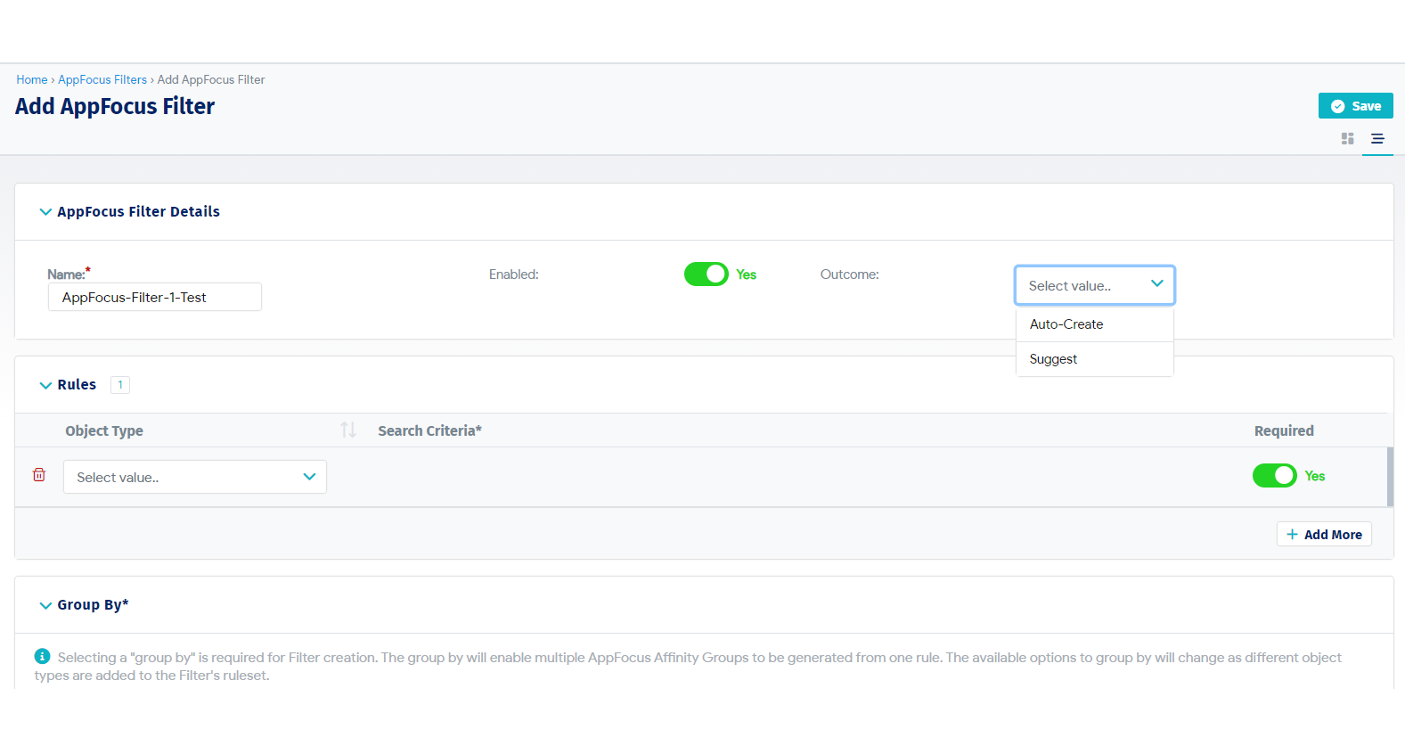 Select a Group By value or values for the filter. Group By will enable multiple AppFocus Application Groups to be generated from one rule. The available Group By options will change as different object types are added to the filter's rules.