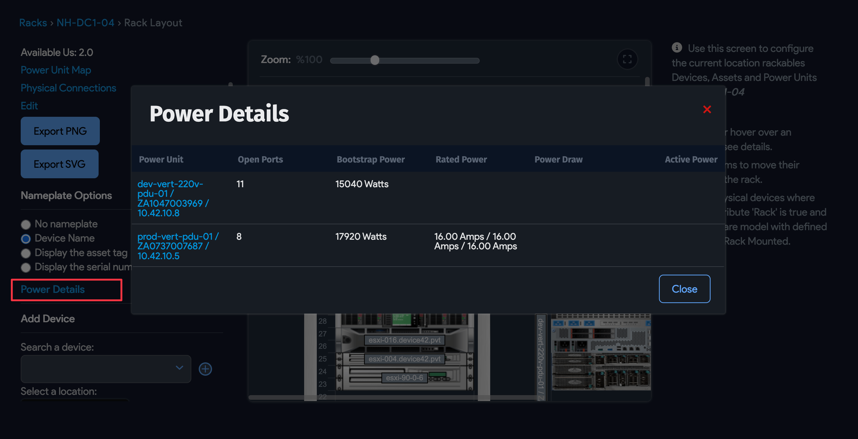 Power units will also be found in the Rack View, which can be found by navigating to Infrastructure > Racks from the main menu: