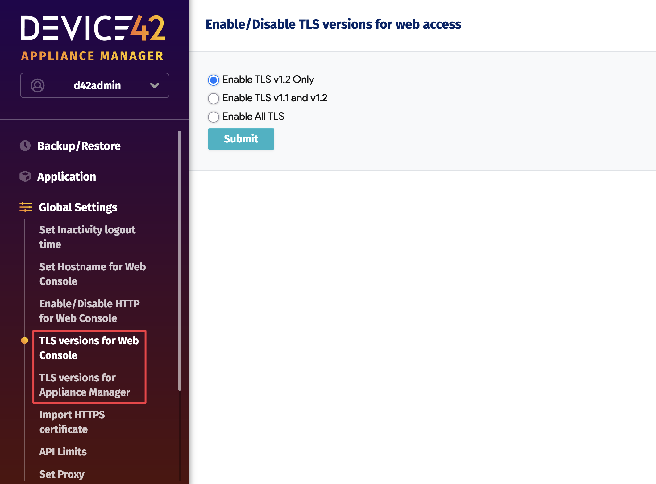 Device42 allows you to restrict TLS versions for Appliance Manager Access. The radio buttons shown below control this feature.