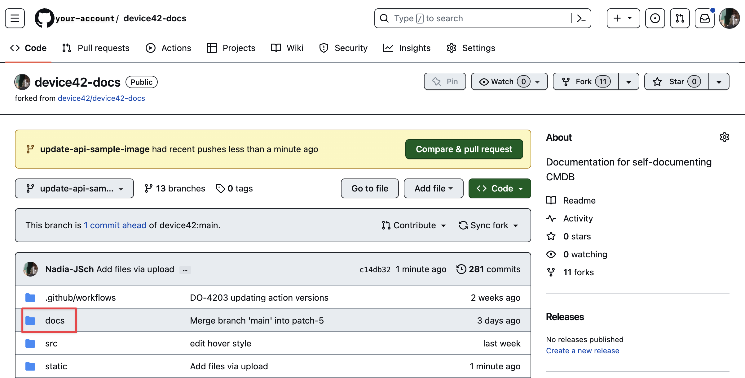 - Fork the Device42 repository OR navigate to your existing forked Device42 repository.