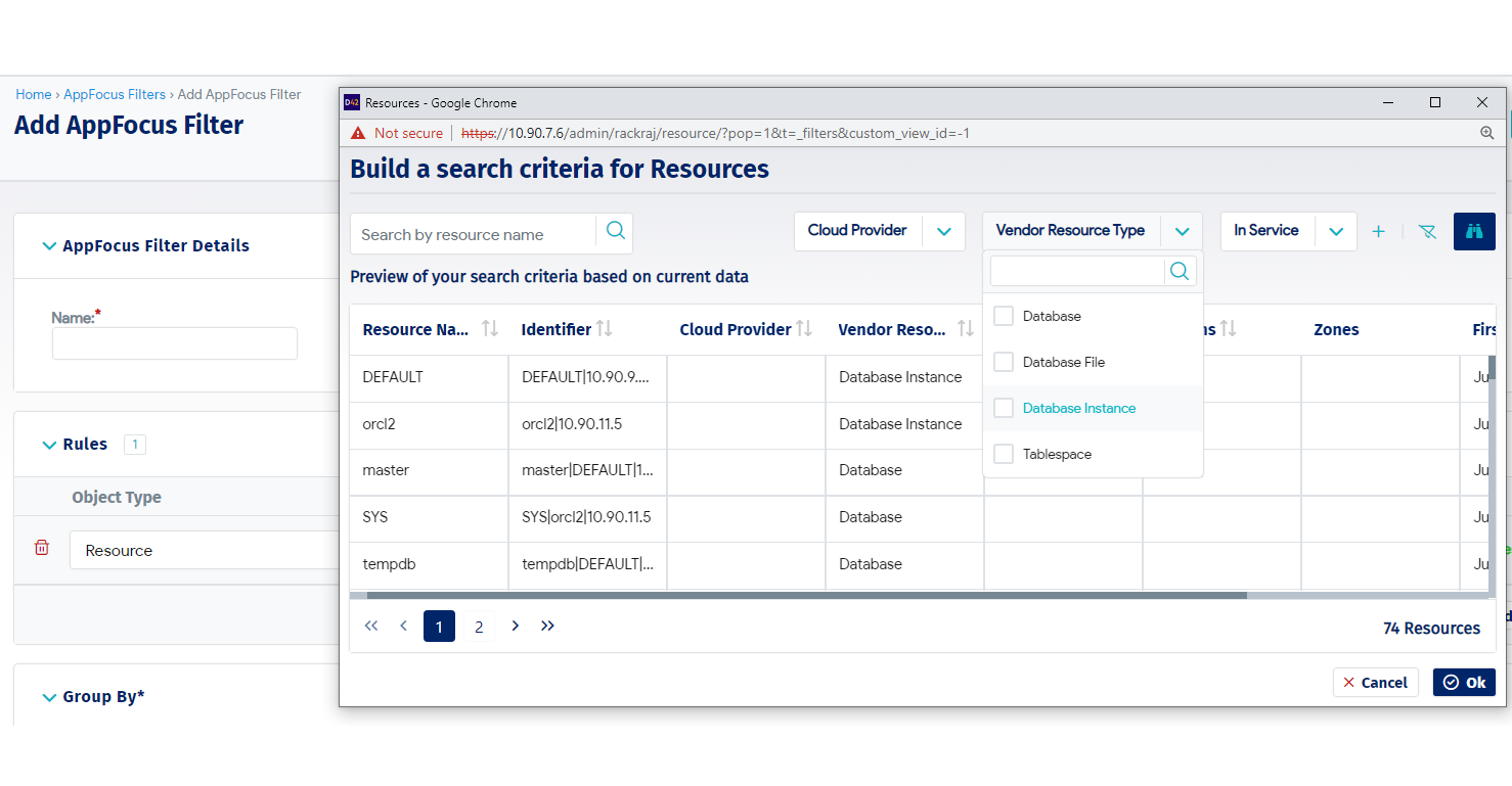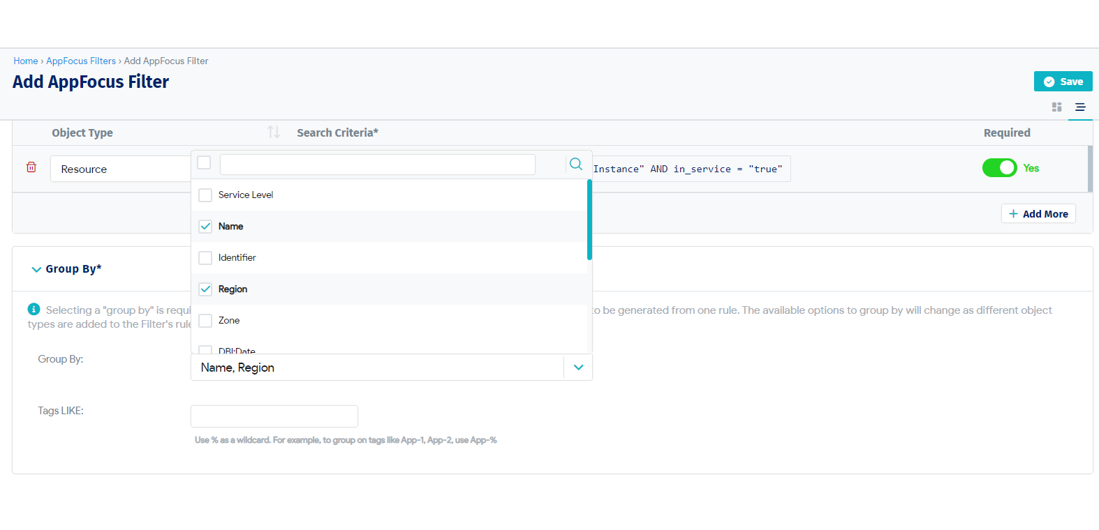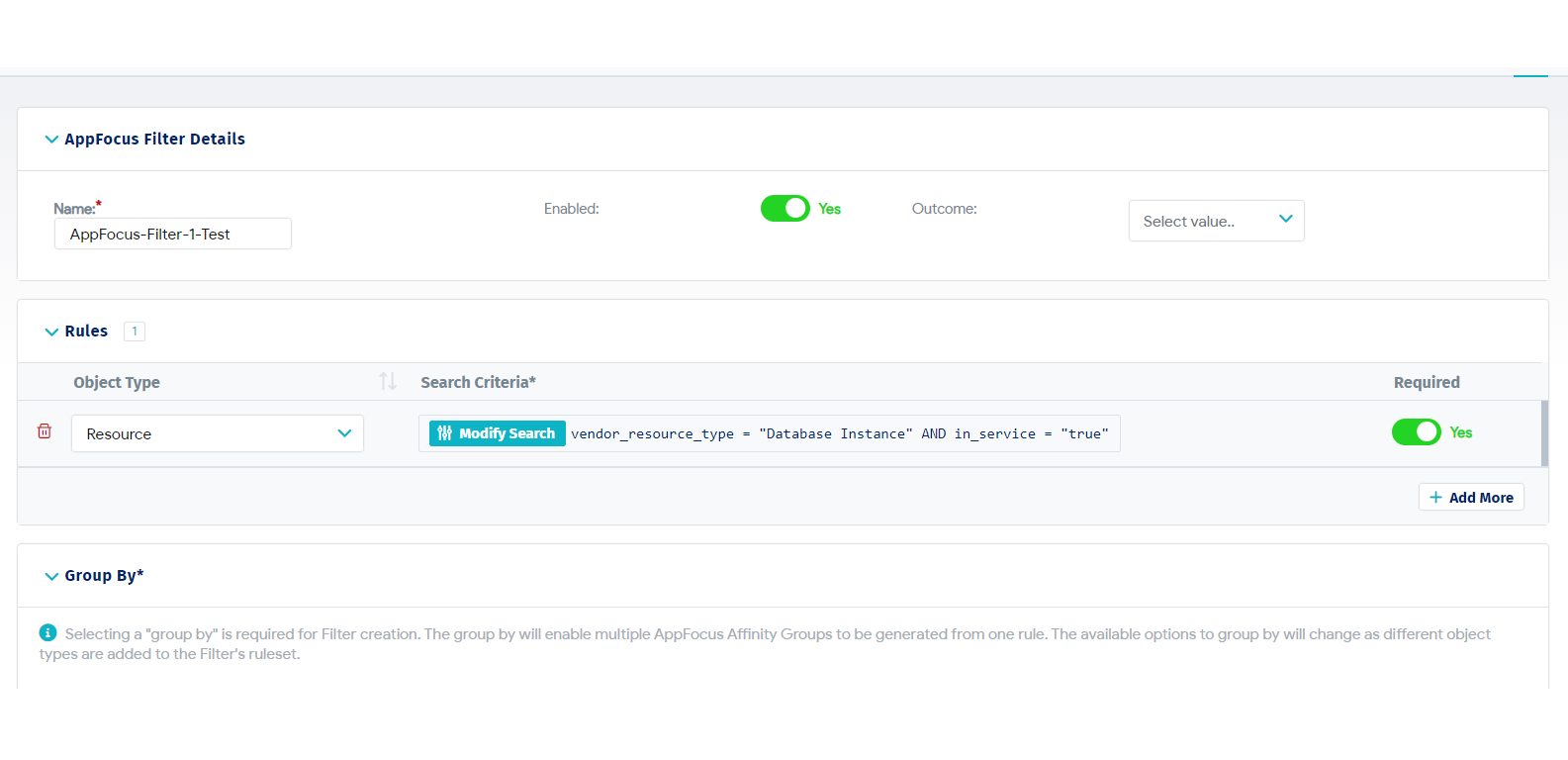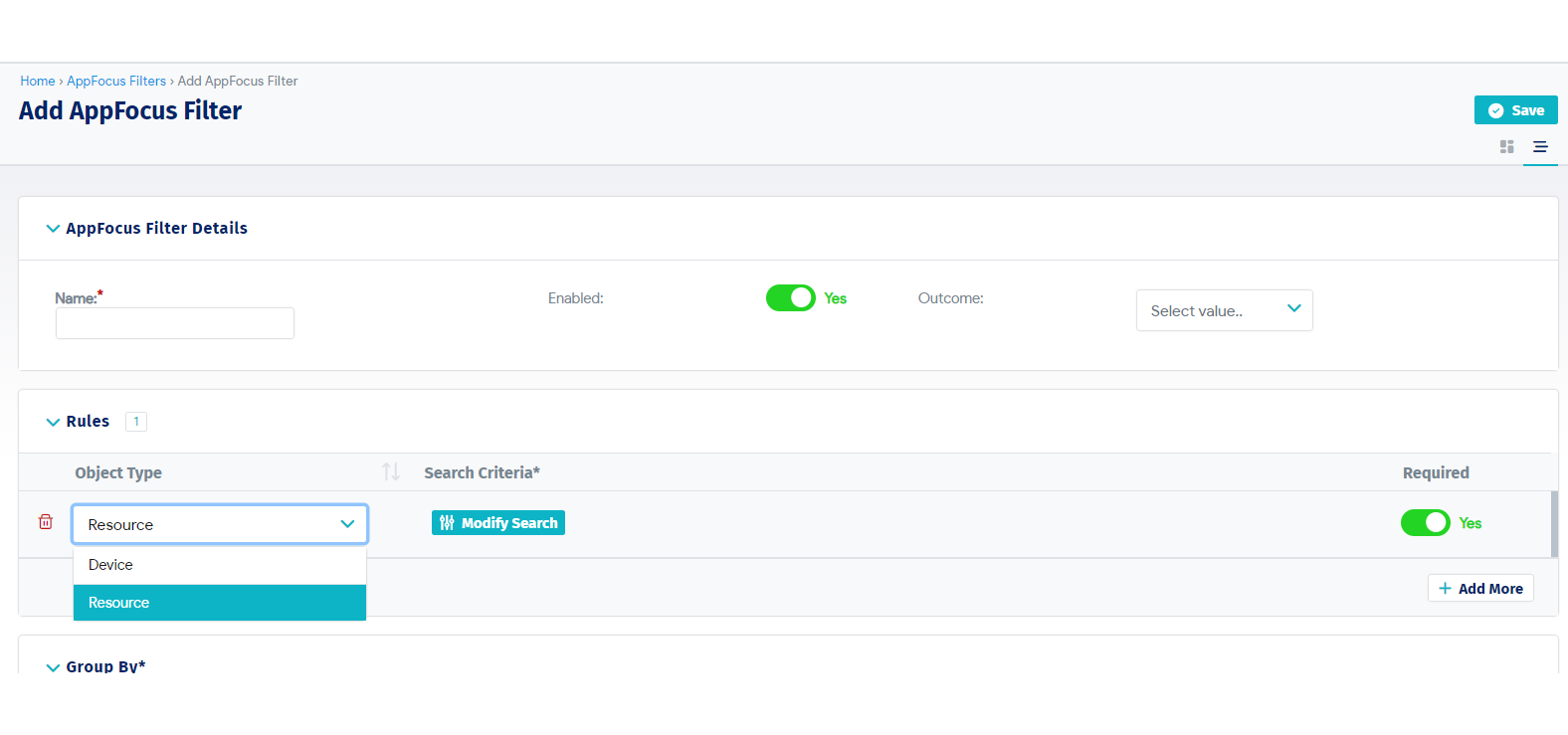 Select a Group By value or values for the filter. Group By will enable multiple AppFocus Application Groups to be generated from one rule. The available Group By options will change as different object types are added to the filter's rules.