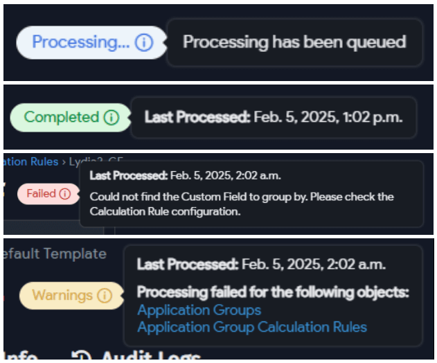 There are four statuses for Calculation Rules: Processing.., Completed, Failed, and Warnings. Hover over the i icon for more details.