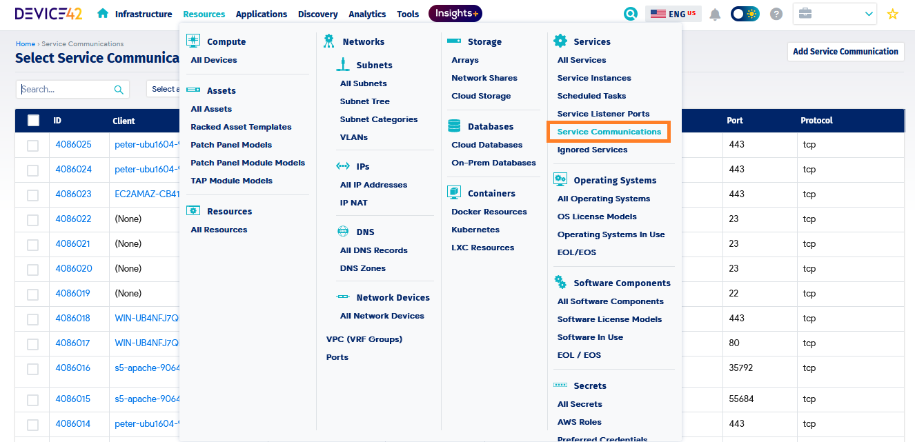 Select Resources > Services > Service Communications to view, edit, or add service communication information. Click the Client device name to edit an existing service communication.