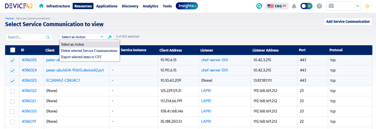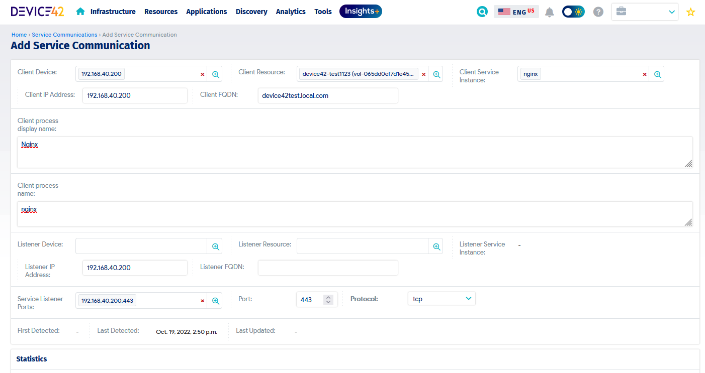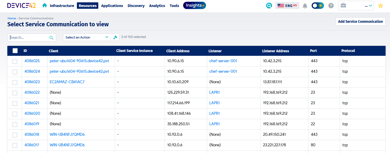 Select Apps > Services > Service Communications to view service port IP statistics. As of version 16.00.00, Device42 has revamped statistics collection. Statistics are now only kept from a listener perspective and are client-IP-centric (not per client service). Previously collected statistics now appear in the Classic Statistics section of this page. See below for descriptions of the Netstat and Netflow statistics Device42 collects.
