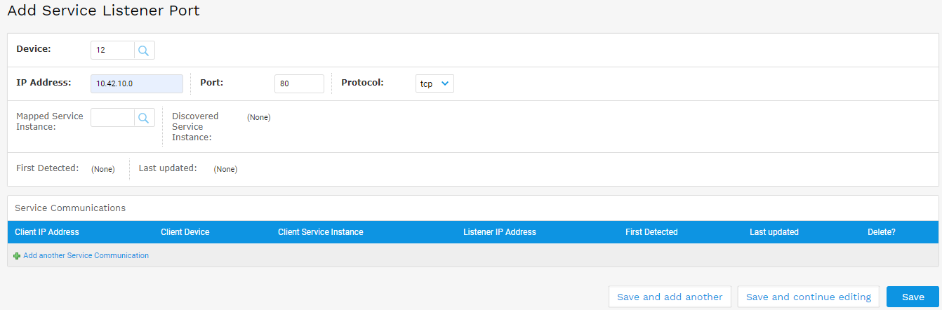 Select Apps > Services > Service Listener Ports to view, edit, or add a listener port. Click the Service Listener Port IP to edit an existing listener port.