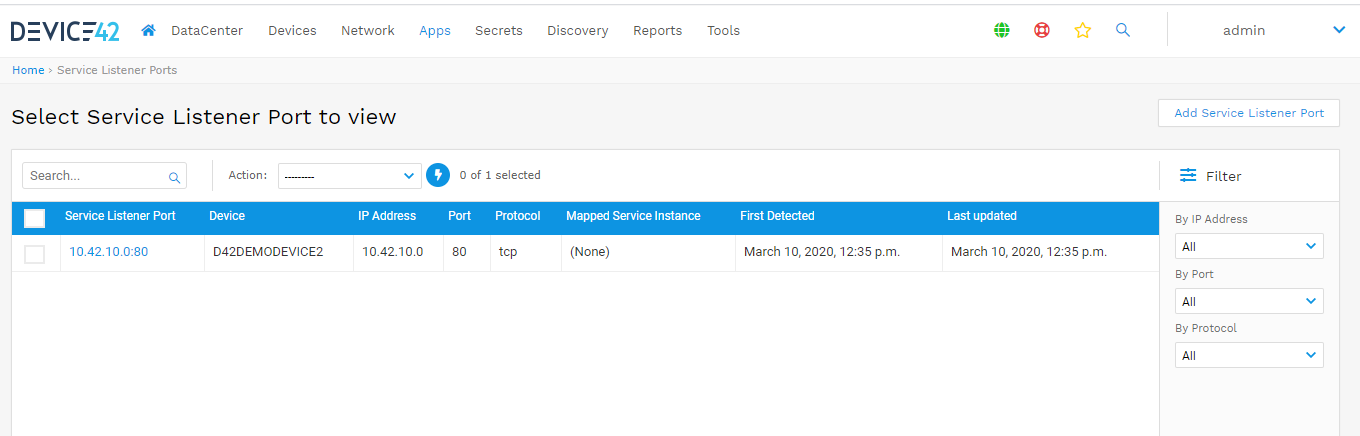 Click Device to create the listener port you want to add. Device42 displays the Select Device dialog – you can also add a new device from this dialog. Click on the name of the device for the listener port. Enter an IP Address, a Port, and select the Protocol. Enter any other information you want, and then click Save to add the listener port.