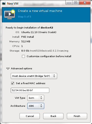 Choose your virtualization type under the Advanced options and select i686 as the Architecture.