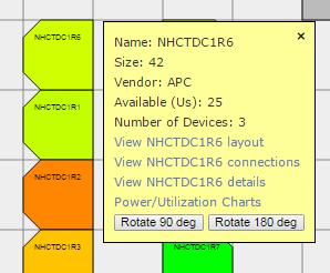If you hover over a rack, you will see a popup. The Power/Utilization Charts hyperlink takes you to a display showing the power history for each infeed and outlet.