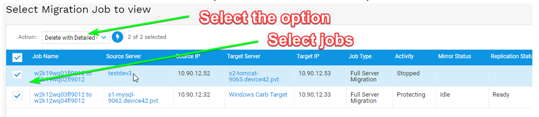 - Check the jobs you would like to delete from the Migration Jobs list page and select Delete with Detailed Confirmation from the Action menu.