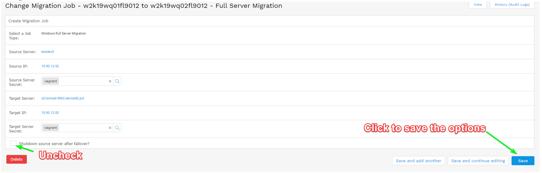 - Now click Delete at the bottom left of the Change Migration Job page. The job will be deleted from D42 and the target server running Carbonite Migrate.