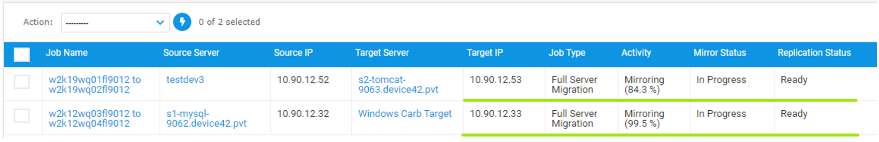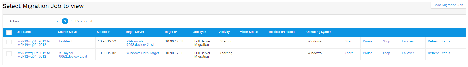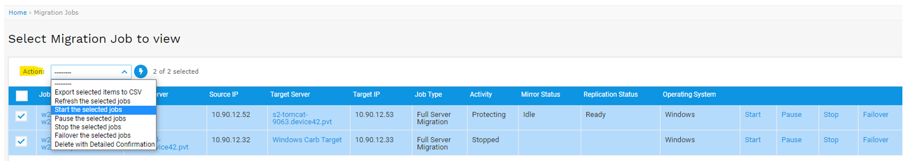 - You can control multiple jobs at once by selecting several jobs on the Migration Jobs list page and selecting one of the Action drop-down commands.