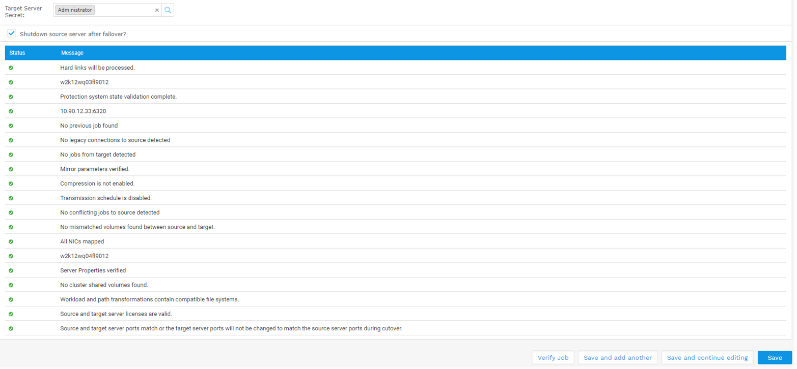 - If any errors are found, they will be displayed in this table and can only be fixed by using the Carbonite Replication console or performing system administrative tasks required to fix a particular failed verification step. In this case you will not be able to save this job until the issues are resolved. If resolved, you should click the Verify Job button again to have the job be verified.