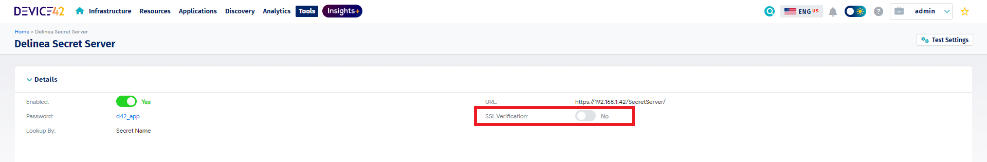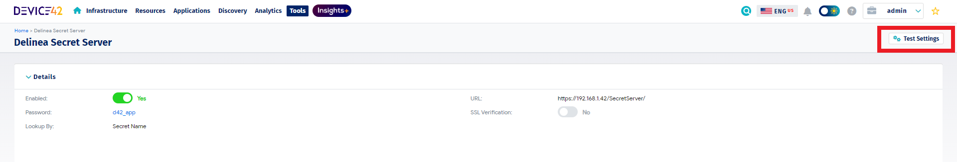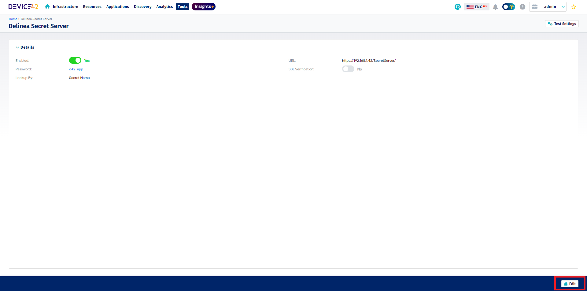 - Select Tools > Integrations > Delinea Secret Server from the Device42 menu.