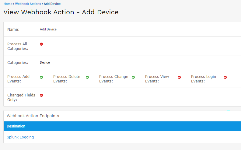 - Select the Webhook Action Endpoint, which should be the endpoint(s) created in the step above. The example here processes Add, Delete, and Change events for the Device object in Device42. As a test, a “Splunk Logging Device” was created, changed, and deleted.