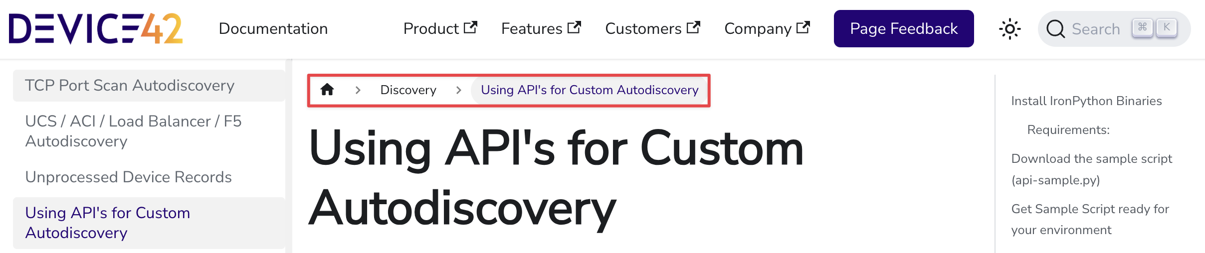 Determine the location of the Markdown file of the page you want to include the new image on. Go to the documentation website and note the folder structure at the top of the article. In this example, the "Using APIs for Custom Autodiscovery" page is in the "Discovery" folder.