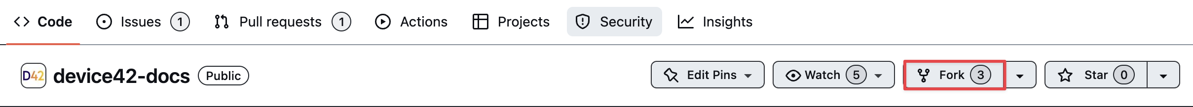 Create a GitHub account and fork the Device42 repository by clicking on the "Fork" button. Forking a repository creates a copy of the repository that you can safely make changes to without affecting the original.
