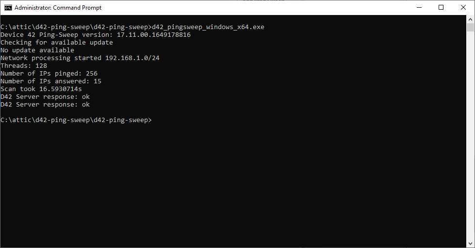 .exefile. For Linux, set thed42_pingsweep_linuxfile as executable by running the command:$ chmod +x d42_pingsweep_linux - Copy or move