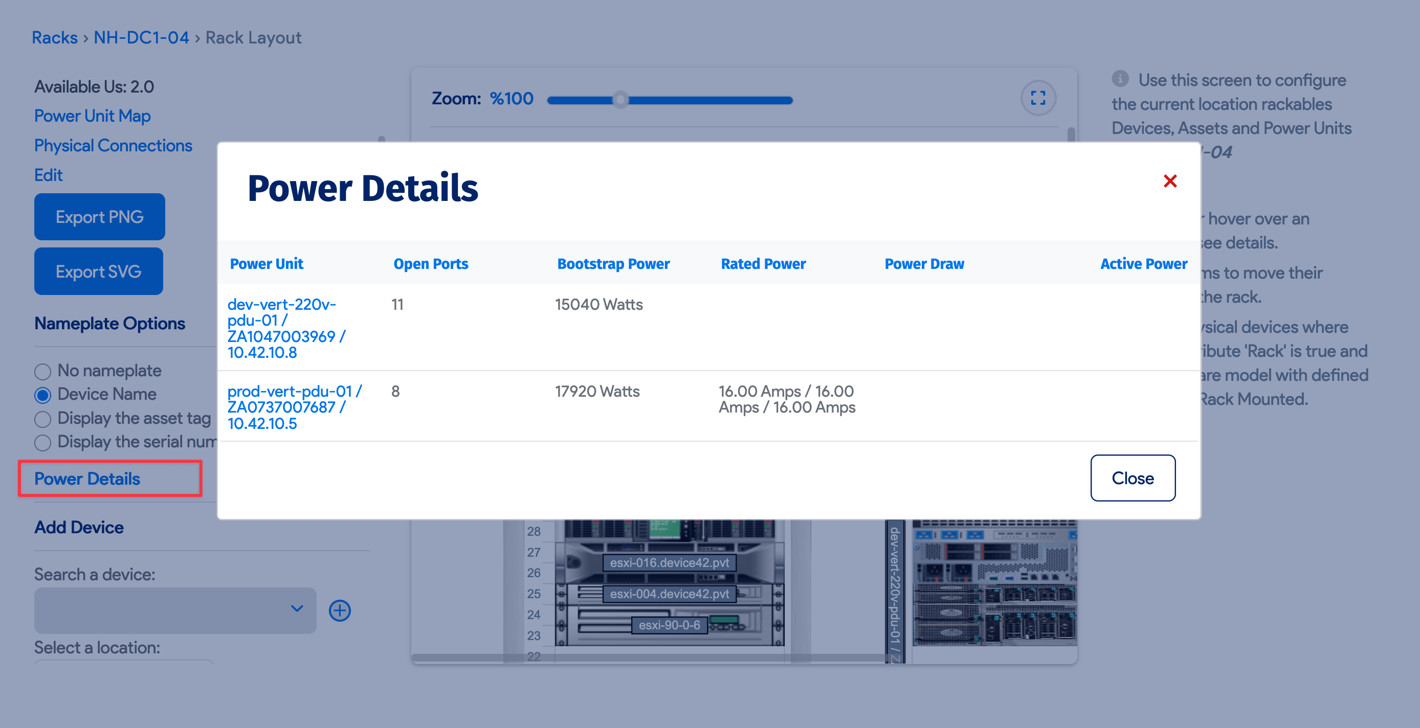 The PDU watts sum will also be visible on the rack layout page as shown below. Click Power Details in the left pane to see the PDU power details.
