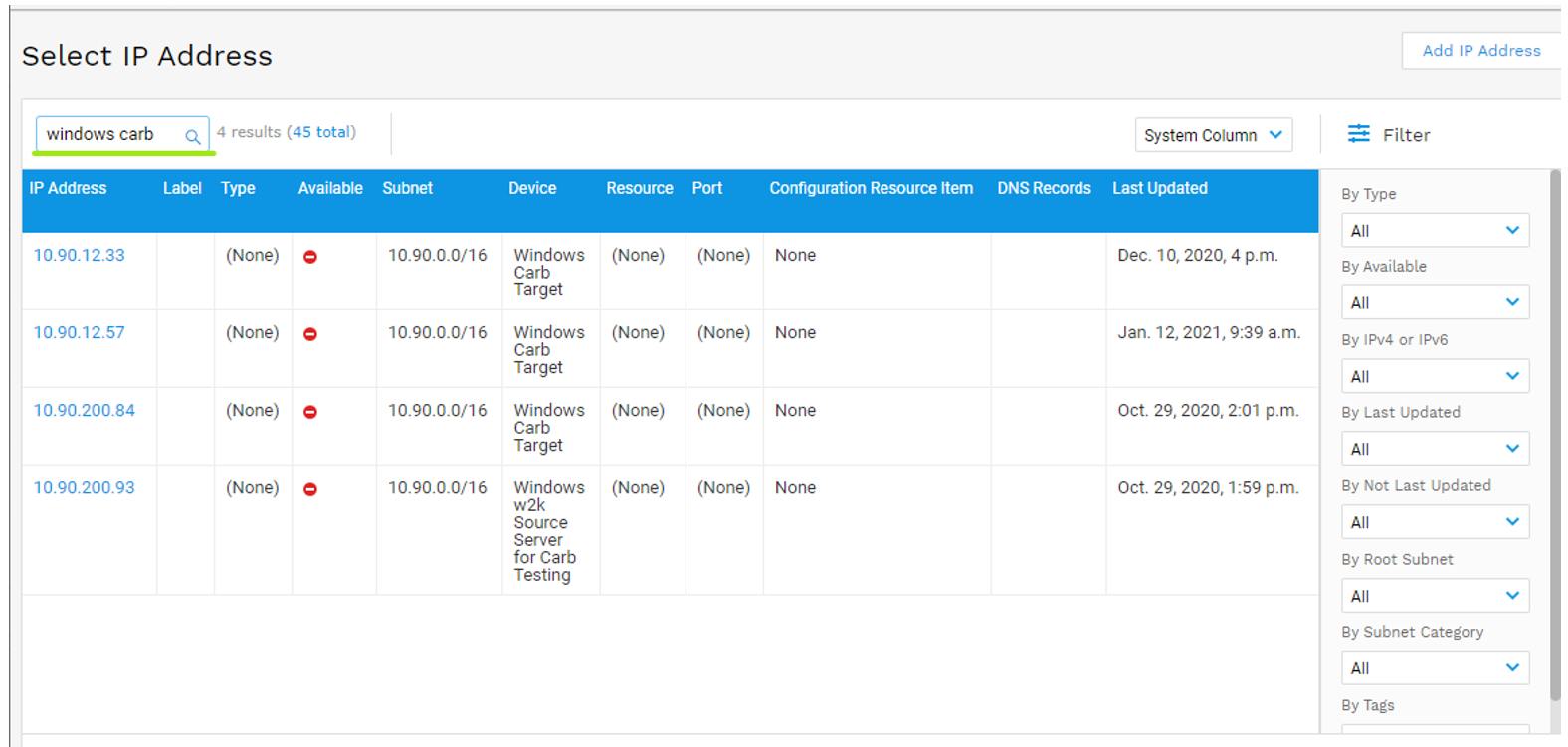 - If you click the lens icon, you are prompted with a pop-up window which lists all existing IP addresses in the system and the Device name associated with that IP address. Please note that before selecting an IP address, you should make sure it is attached to a device in D42. You can also search for a device by its name by entering the term in the search field.