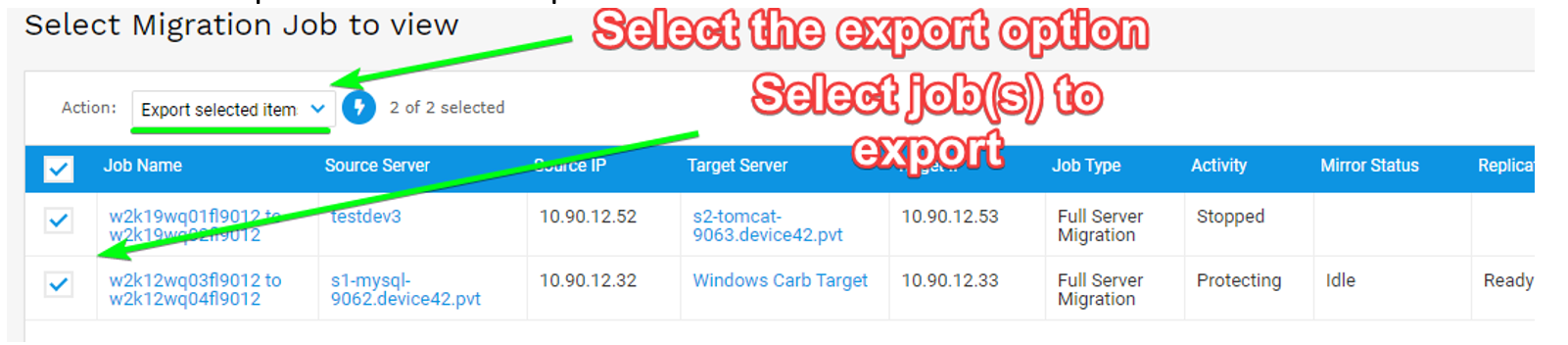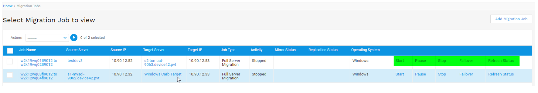 - You can control multiple jobs at once by selecting several jobs on the Migration Jobs list page and selecting one of the Action drop-down commands.