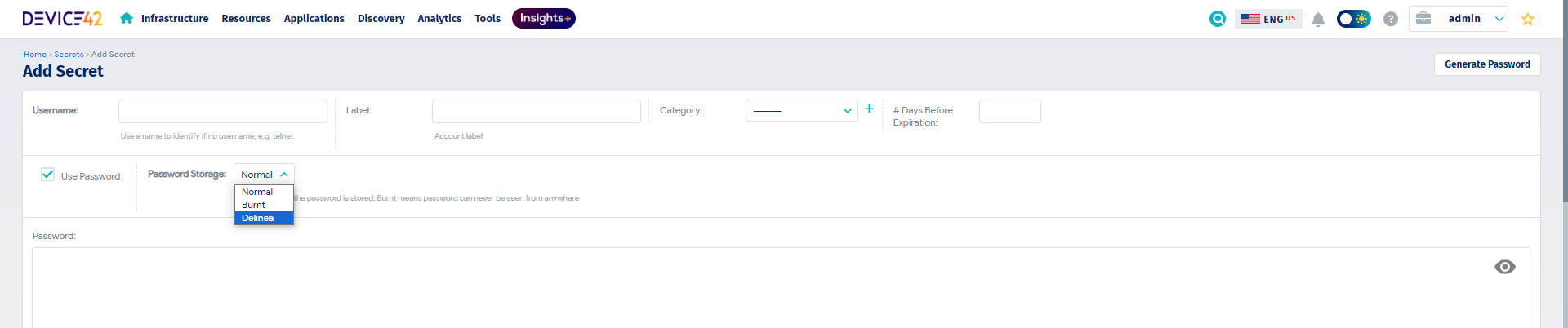To create a new password object using Delinea Secret Server, simply select Delinea Secret Server from the Password Storage drop-down menu: