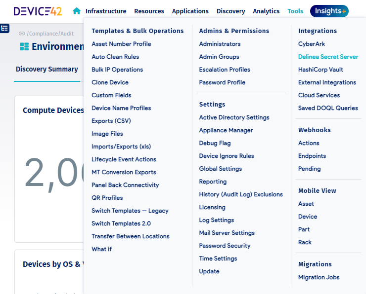 - Select Tools > Integrations > Delinea Secret Server from the Device42 menu.