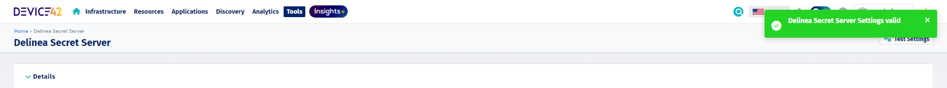 - The Test Settings button attempts to validate the supplied configuration settings by retrieving a token from Delinea Secret server. If a token is successfully retrieved, a message stating "Delinea Secret Server Settings Valid" should appear in the top right corner. (Example Success Response Below)