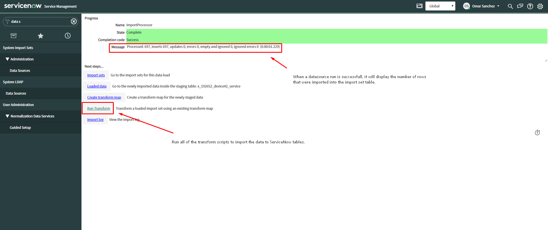 The scheduled imports first run the respective data source to collect and store data in the import set tables for a given data source. After this data has been imported into this table a transform script is run to map the data into ServiceNow's internal tables. The ServiceNow integration plugin leverages ServiceNow's IRE module. For more information on this feature, please visit ServiceNow's documentation page: