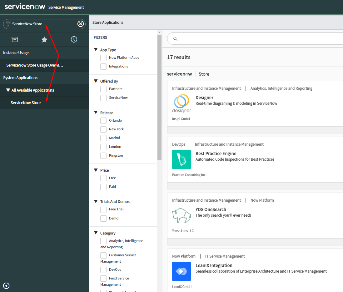 Alternatively, from your ServiceNow instance, search for "plugin" under All to navigate to the plugins page, and from there, search for "Device42".