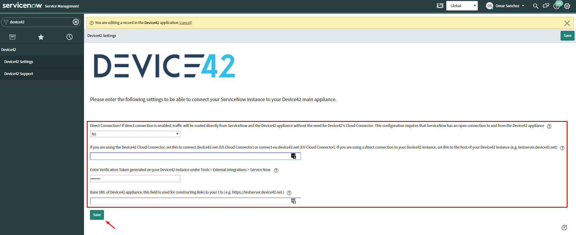 connect.device42.net). - In the next field, paste the Device42 Verification Token you noted in step one, above.