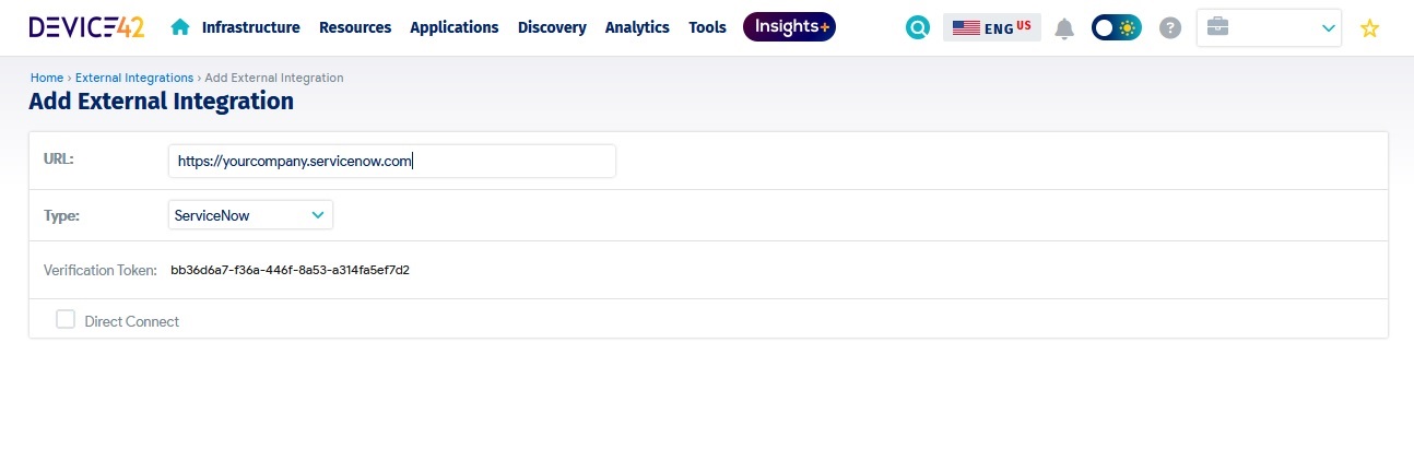 If you have the latest version of Device42, you will see an option on the ServiceNow external integration page that displays a Direct Connect option. If you would like to configure the integration to use a direct connection, ensure that this option is checked. You cannot go back and change this option (you will have to delete and set up a new configuration), so confirm your settings before creating the integration.
