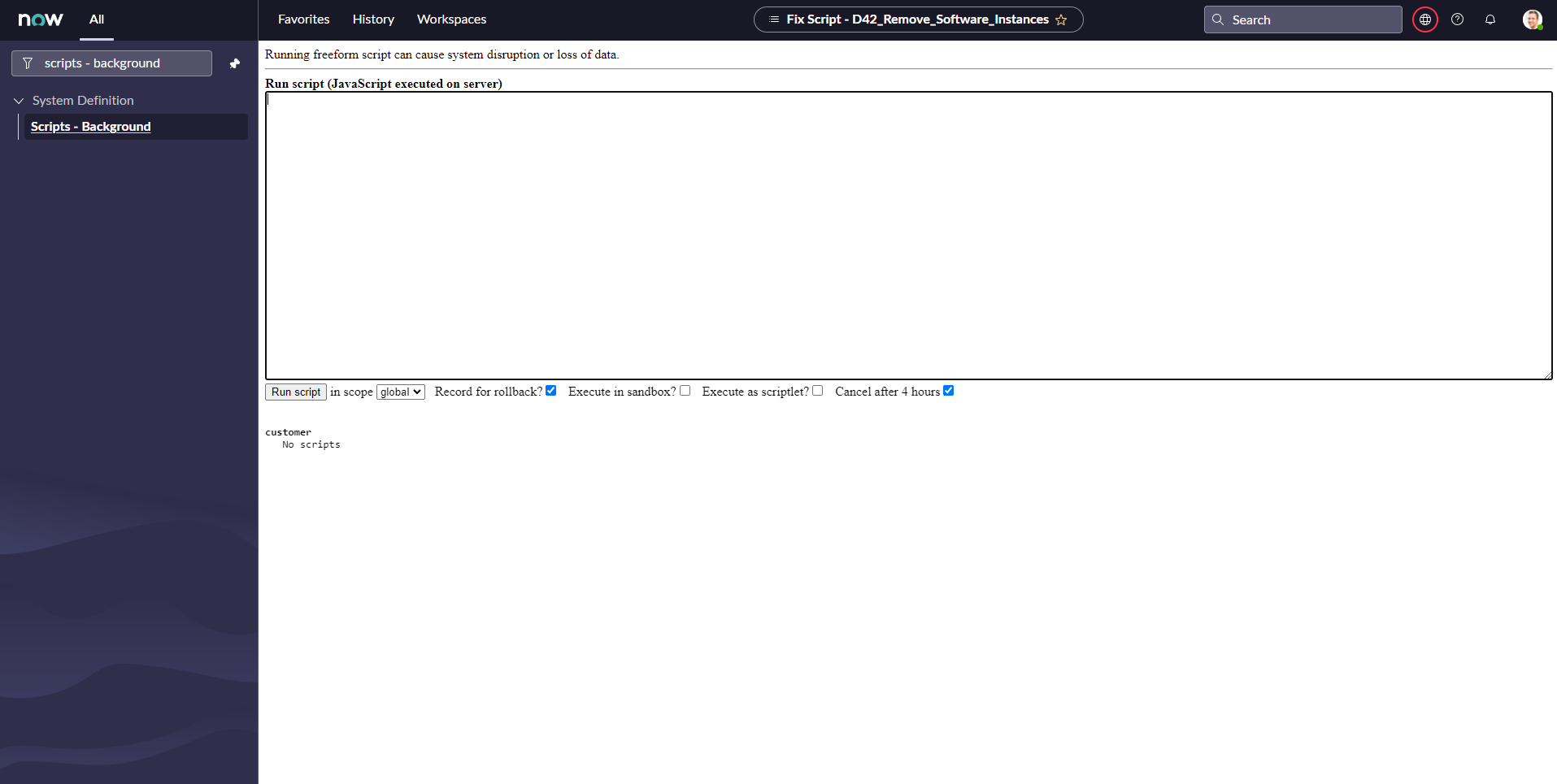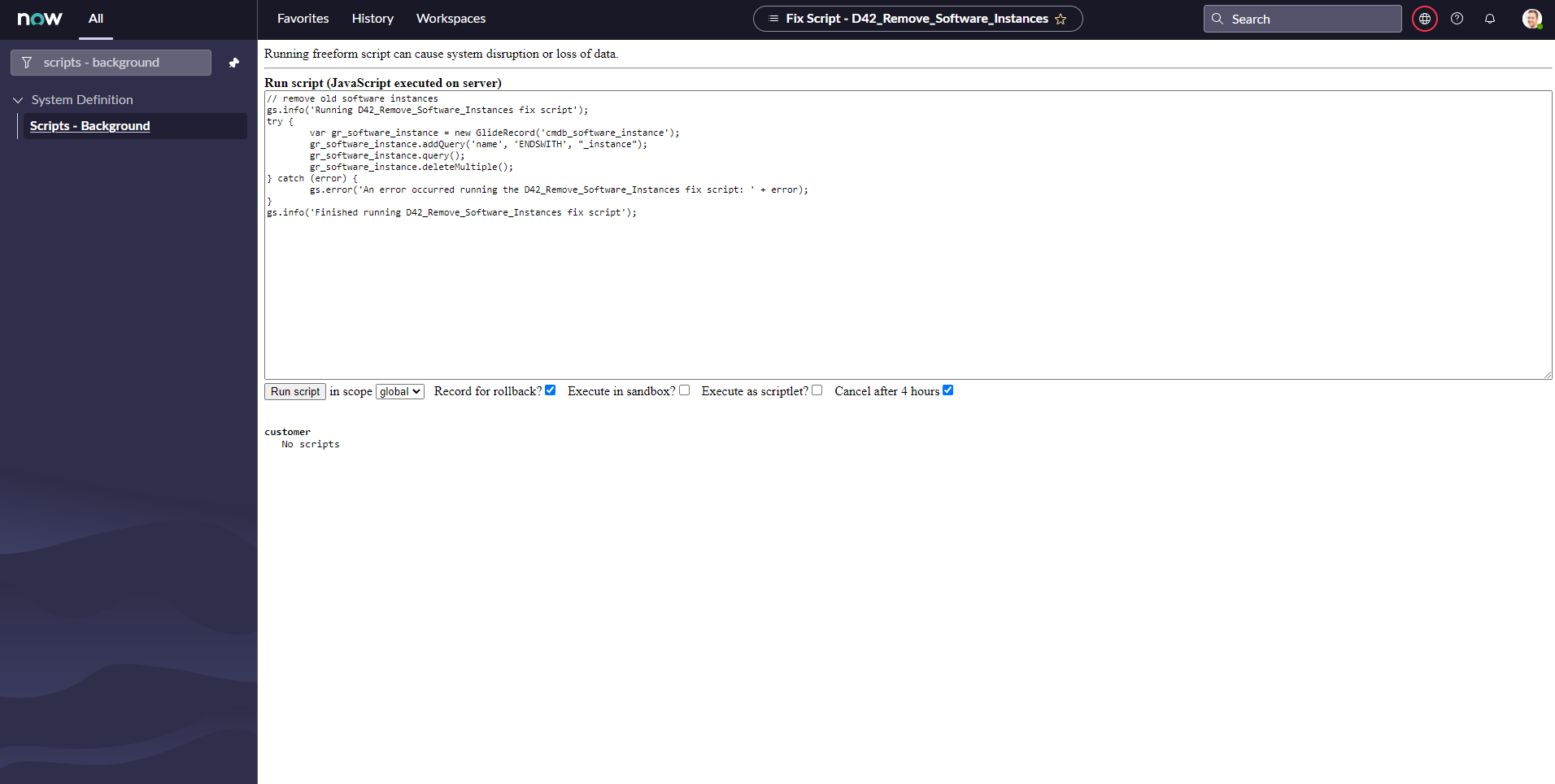 If you updated the ServiceNow app from version 4.0.0 or older, you should run a script to delete old software instance records that were created by the app and are no longer needed. The cmdb_software_instance records that should be deleted will have a name that has the format software_name_instance. To delete these records, follow the steps below.
