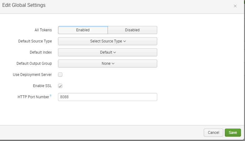 - Click Global Settings in the upper-right corner and select “Enabled” for All Tokens, determine if SSL needs to be enabled, and define the HEC’s listening port number (8088 is used in this demonstration), then Save.