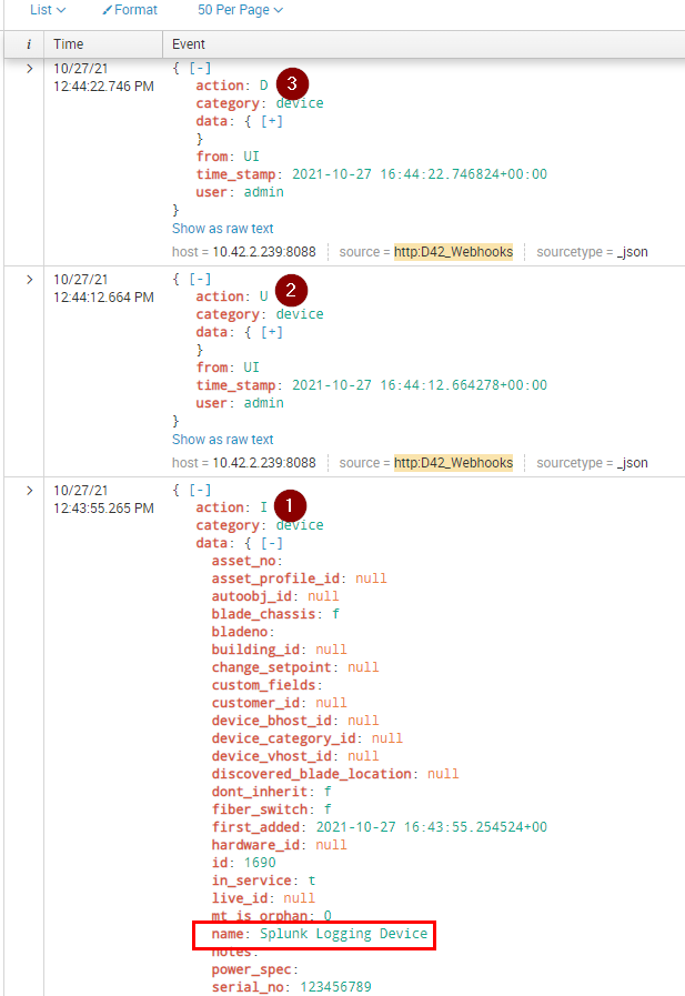 This section will describe creating a Webhook Action in Device42, in order to define the data sent to Splunk. This will then be validated in Splunk to verify that it is collecting the raw json webhoook data by utilizing Splunk’s search functionality.