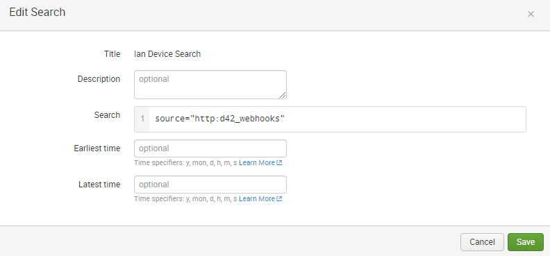- Title your Report, enter search parameters, and configure any optional settings as needed. The example here uses source=”http:d42_webhooks” as input and looks only for events caught by the HEC configured earlier.