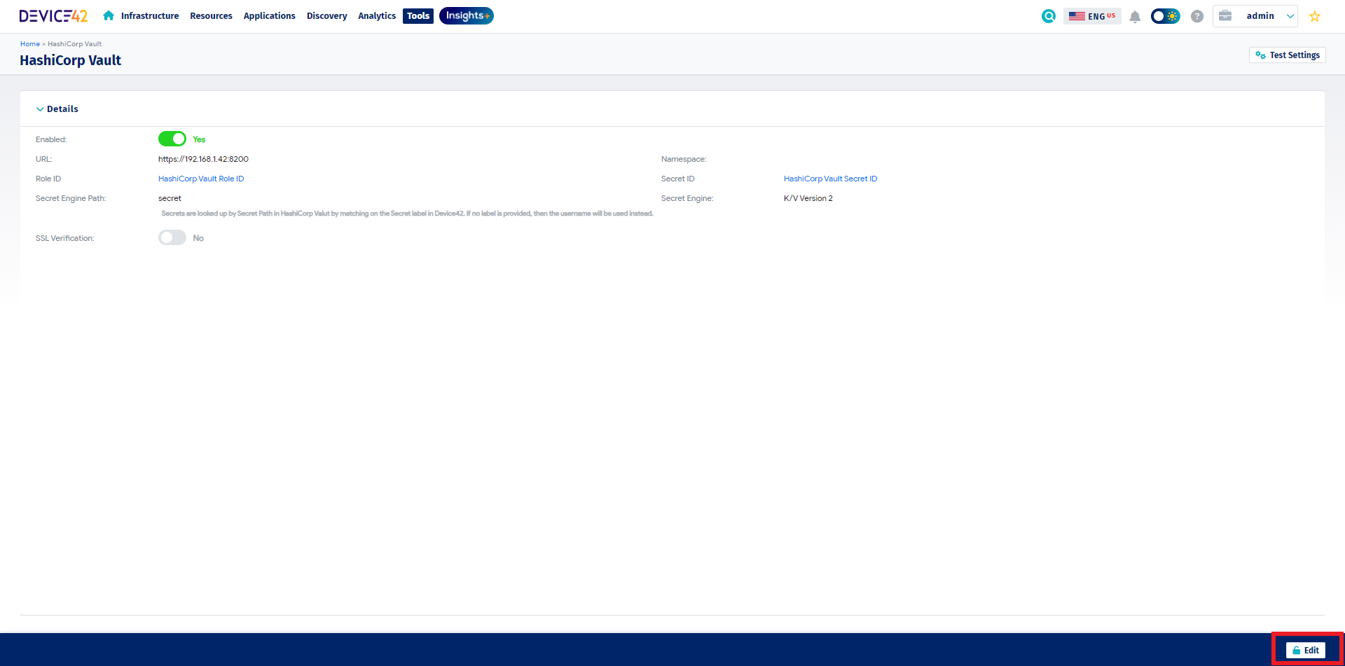 - Select Tools > Integrations > HashiCorp Vault from the Device42 menu.